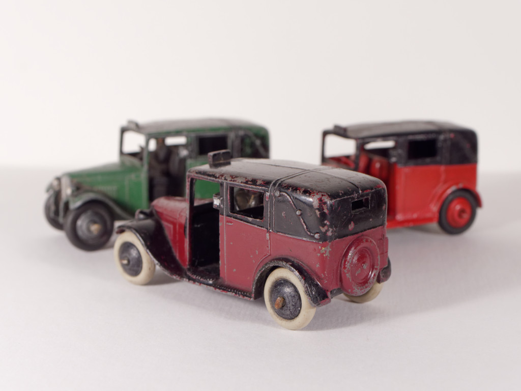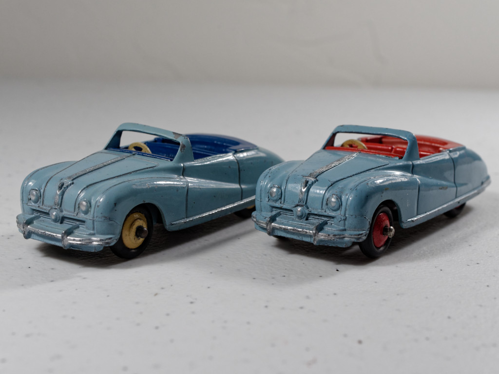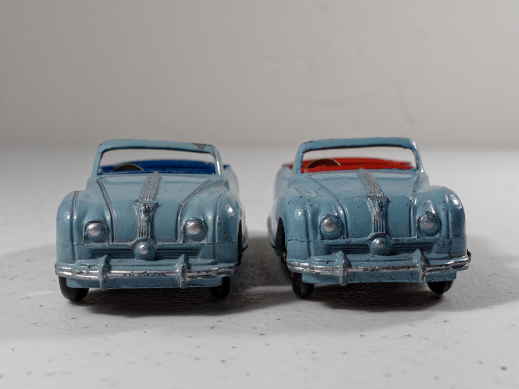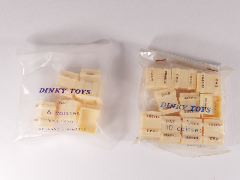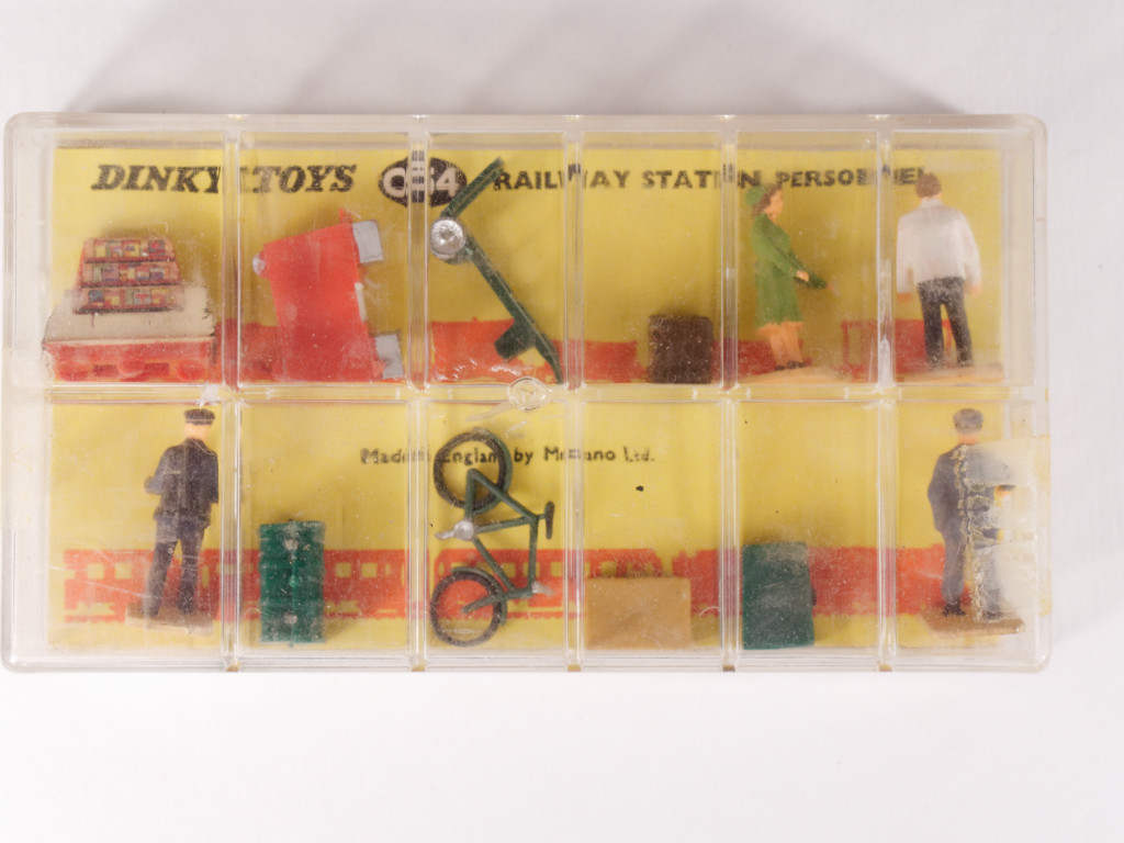 Some miscellaneous new items here, including an early postwar addition to my fleet of tatty taxis, and the Dublo Land Rover/horsebox. (Is the narrow width of that horsebox in any way prototypical? The poor animal has no room to turn around, and there certainly isn't room for two horses.) I also cherish Dinky figures and accessories, and was adding to my collection of both even though I have another sample of each item. I'm glad I got another set of the French 849 cases, because the others I have all came as a set of six, as seen on the left, and the new one is a set of 10! In the Encyclopaedia, Jacques shows that the 851 set of mixed accessories came in a packet of 8 or a packet of 10, but the variation in the 849 set has not previously been recorded.