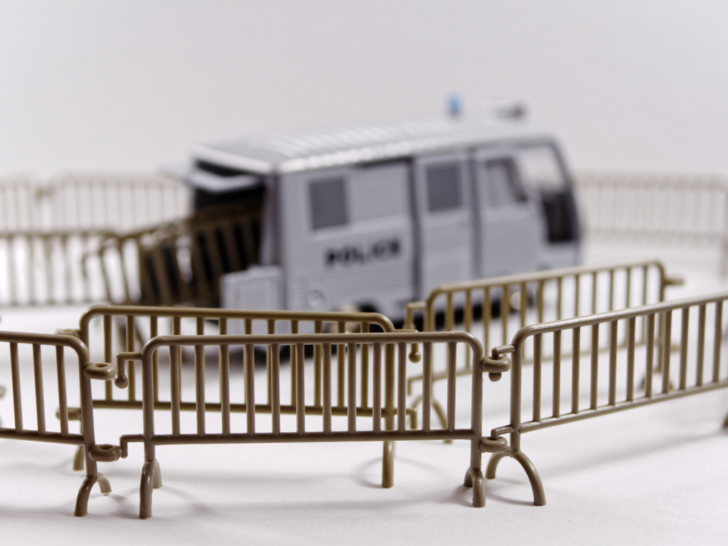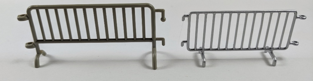 Several days ago I received what ought to be my last-ever acquisition, as I have no more display space nor room for another cabinet. (But of course I say 'ought to be' because I've made that promise to myself before.) This is an item I've wanted ever since I saw it in 1961 in a Dinky catalog as a five-year-old -- the French #845 Barriere Vauban. My local stockist did not have any and could not get the item. (As many will know, the longtime U.S. distributor H. Hudson Dobson ceased trading that year. Subsequent distributors in the 60s did not import the entire Dinky range -- and especially not most French models -- so '61 would have been the last year the barriers were imported. Suffice it to say they turn up very rarely in the States. I obtained my barriers from a Canadian seller, and now have twenty -- two packs worth. They did not come in the original sealed plastic packets, so the value is of course lower, but on the other hand now I can play with them as I always wanted to. A dream fulfulled many many many years later! I present a comparison between the plastic Dinky barriers and a current Norev production, which is the same barriers modeled in metal. I had not expected the difference in scale -- the Dinky barriers are 30mm high whereas the Norev is only 25mm high. Assuming that the 12-bar barriers modeled by both Dinky and Norev were the same height as the 14-bar Vauban barriers still sold today, I calculate that the Norev model is 1/43 scale, while the Dinky, surprisingly, is 1/42nd. It is a pity that Dinky never modeled a trailer to carry the barriers around, since not many will fit into a van!