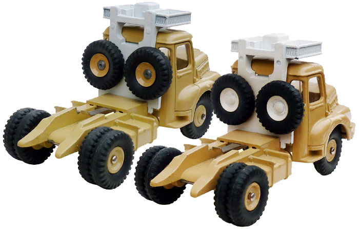 The sand coloured spare wheels are the early ones, they were painted separately before assembly. It was obvious that assembling them unpainted and painting the sub assembly in a single operation was easyer and a tiny bit cheaper although incorrect as the truck's hubs are not white.