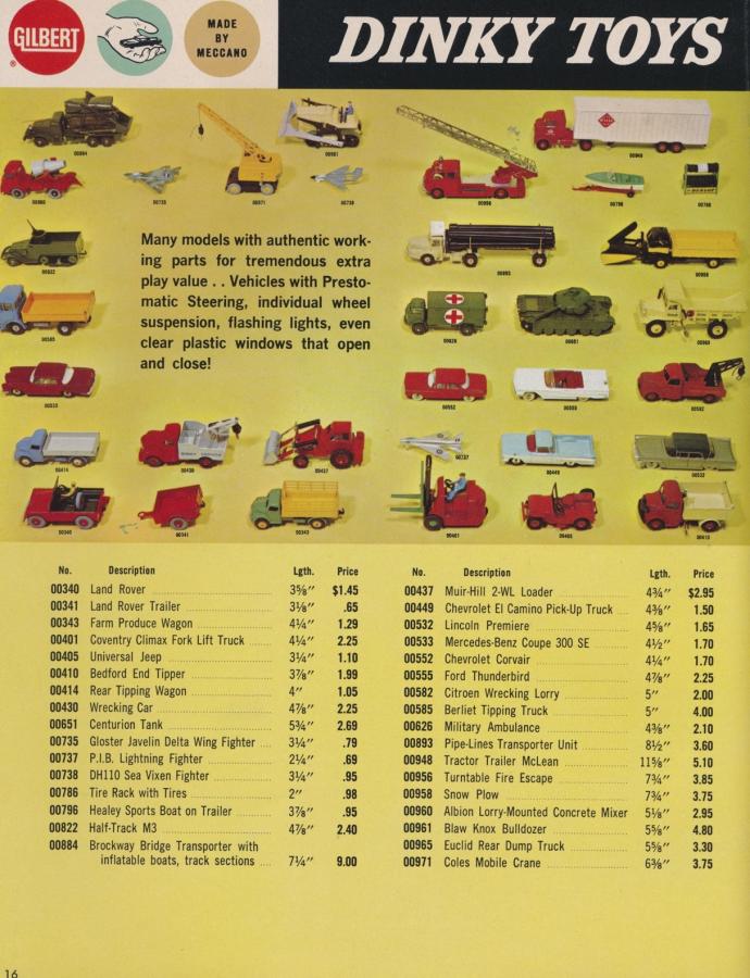 At last, here is what I have been working on! This display case is from the year 1963, when Gilbert briefly distributed Dinky Toys in the U.S.A. They offered a reduced range of models -- strangely omitting some that would have done well, including the U.S. school bus -- and as you will see from the price list, I have loaded the display with each one (except for two small airplanes, one of which I do not own). In practice, of course, a given toy shop may not have stocked every model, or they may have had additional Dinky Toys in stock obtained from previous distributors. But this makes for an interesting look at the Dinky range in the year before the Lines Brothers takeover (and gradual introduction of bloated 1/42nd-scale models). To enhance the time-travel qualities of this display, which originated in a family-run toy shop in Illinois, I have provided each model with a price tag showing its 1963 price.