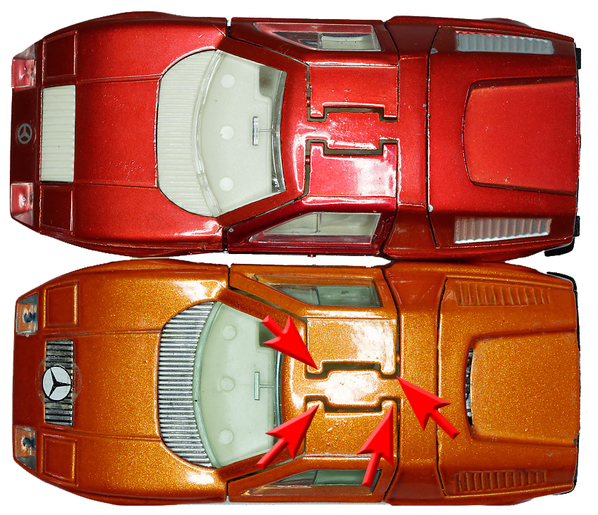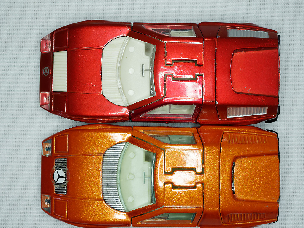 The angles on the Dinky are much sharper than on the Joal. Joal could have made them sharper than the Dinky but not the oposite.On both models the gaps between the doors and the body is quite ugly.Mercedes certainly provided the same body drawings to both manufacturers, this is why both models are so close to each other.Anyway this is an interesting discussion and I am going to copy this post into the proper thread for the c 111 ref. 224.