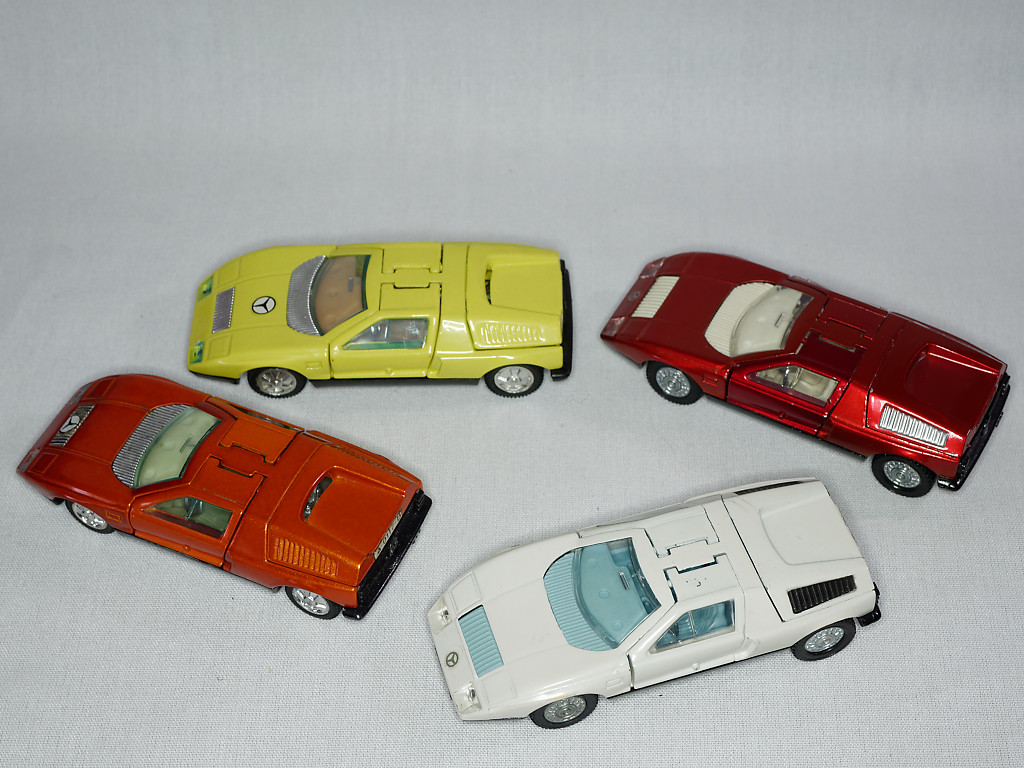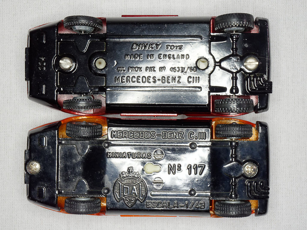 Jacques, thank you for your meticulous work with the photos. Despite the obvious differences in the tooling, I am still puzzled by the great resemblance between these models! Both the Dinky and the Joal are indeed 'clunky and unattractive,' though to be fair it is worth noting that Mercedes refined the shape of the C-111, and I think most toy manufacturers based their models on the later iterations. Here are a couple of photos of the version modelled by Dinky and Joal. An oddity with the Joal is that it is marked on its baseplate as being 1/43 scale. In fact, the Joal model is the same 101mm in length as the Dinky. Since t unsafe link, it is easy even with my limited math skills to see that both models are 1/42nd scale. (The Dinky Encyclopaedia listed them as 1:44 in my copy, an obvious misprint.) I do not know what other models by Joal were 1:42 scale at this time, but clearly the Dinky influence was blatant