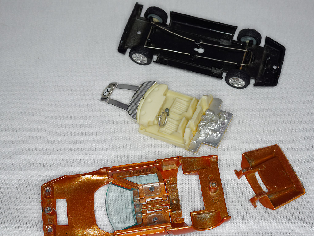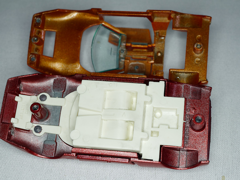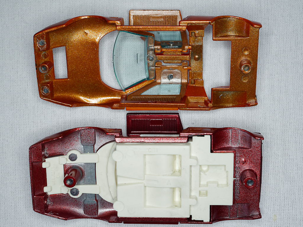 ... and now that I have several more C-111s, I decided to take apart both a Dinky and a Joal sample to make further comparisions. The Joal is either made from modified Dinky tooling, or it is merely the most faithful copy of a Dinky ever made by another manufacturer. I could not disassemble the Dinky completely because the plastic interior is riveted in place, but still thought this comparison might be interesting.