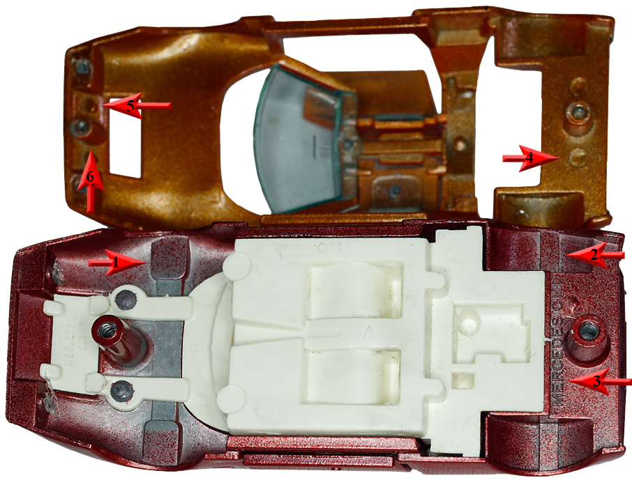 Dear JohnnyThank you for showing us these pictures which answear the question of : 'has the Joal C 111 been cast in the same mould as the Dinky Toys one ?' The details 1 and 2 and the marking 3 could not have been removedJoal had not yet learned how to cast models without ejector marks which Meccano and Solido knew how to do.There was no aparent reason to move the spigot 6.