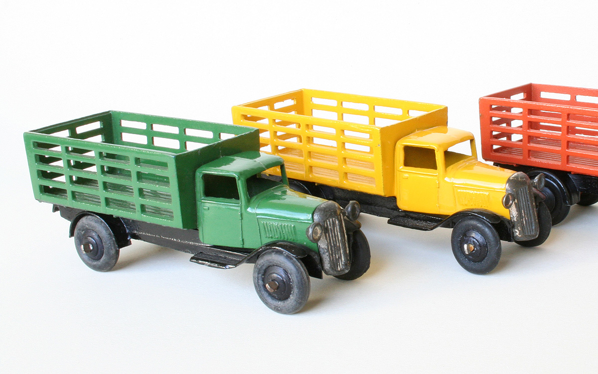 Two similar but different pictures,the one on top taken thirteen years ago,the one on the bottom taken today.The difference is the orange type 4 example in the middle.It arrived yesterday as an ' as new ' replacement of my previous example,a heavily play - worn Market Gardener ' s Wagon,which I bought on a flee market in Amsterdam almost four decades agoand restored it afterwards.Kind regards,Jan
