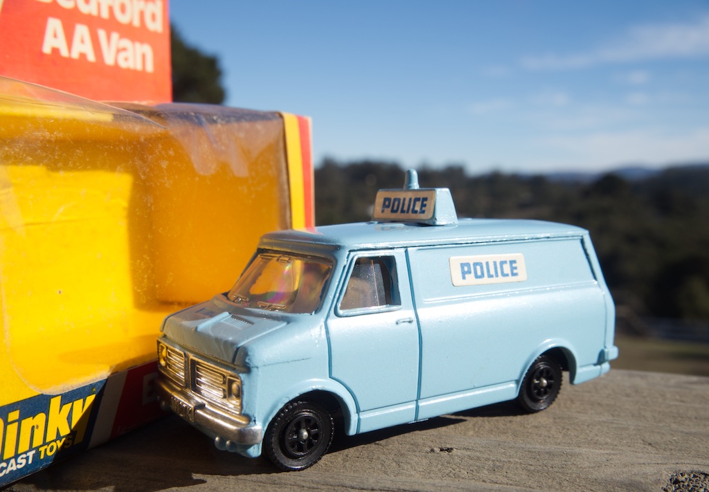 Jacques, thank you for your comments! When young I knew the name of Saint Gobain only through the Dinky, but in later years I owned several 1:1 Renaults and enjoyed seeing the company's name on the glass. And now I learn that the company dates from 1665 and was responsible for creating the Hall of Mirrors at Versailles. Is this the most venerable firm to have its name appear on a Dinky Toy? Or not appear, in the case of my export model! On a much less exotic level, here is an addition to my Dinky police force, as devised by John Gay. I believe the humble Bedford Van at least has the distinction of being the last Dinky Toy from Liverpool with a classic tinplate base. Unless I have forgotten something ...