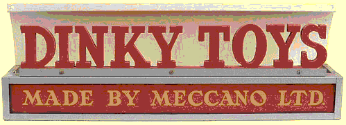 David, Very nice picture of the iluminated Dinky toys sign. It shows very good with the lights on as I have one also. My sign has the screwed in bulbs and fittings as usual in Europe. As they looks very old I am sure these are originals. For England the bulbs are standard plug in. So did Meccano made two different signes, one for England and one for abroad? John.