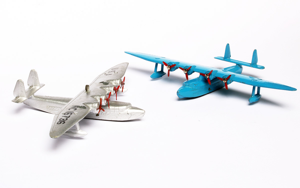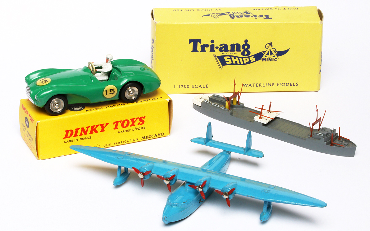 New: a festival of scales, on land, at sea and in the air! The French Dinky no. 506 Aston Martin DB3 sport (1/45) is the new companion to my British example. The ship model is the whale factory ship Tri-ang Minic M733 T.S.S. Vikingen (1/1200), a recent addition, the arrival of which the accompanying whaler couple have been waiting for some 55 years already (they were small and cheap enough to buy from my meagre pocket money in those days). The aircraft is the Dinky no. 60w Flying Boat (c.1/220), the all-blue toy version of the more realistic pre-war 'Clipper III' Flying Boat.