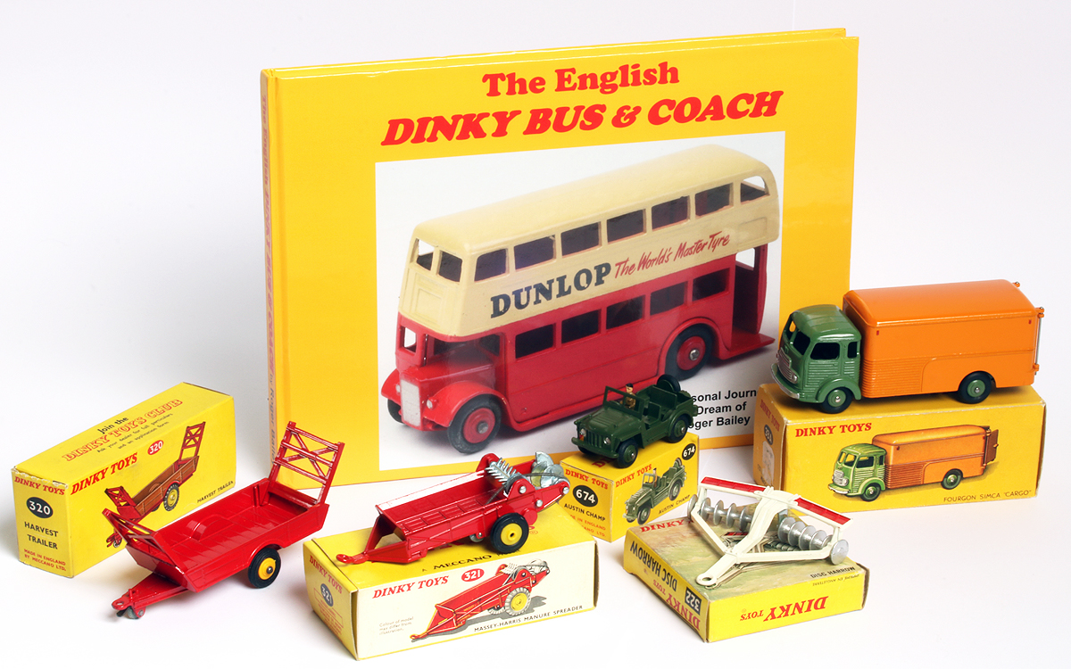 Some lovely new arrivals of the past period. I'm very happy with Roger Bailey's book about the English buses and coaches. A job he started thirty years ago, the result is stunning. Loaded with information in words and images ..., many previously unknown. My big compliments to Roger! The others are virtually mint boxed models, some new, some quality improvements and replacements, like the Austin Champ (no. 674), the earliest version with the driver's arms spread. The French Simca Cargo (no. 33a) is the 'A' cab/chassis type version. A photo added of both A (left) and B (right) types. The farm models are all the latest, end 1960s versions. The Harvest Trailer (no. 320) has rather uncommon red (in stead of yellow) racks. The Manure Spreader (no. 321), also with yellow plastic wheels, shows the new box design, as does the the white edition of the Disc Harrow (no. 322), which has the changed, straight draw bar, to match the new white David Brown tractor (no. 325 of 1967) properly. The Manure Spreader without the previous brand name decals. The last appearance of this trio in the 1970 Dinky Toys catalogue. Kind regards, Jan