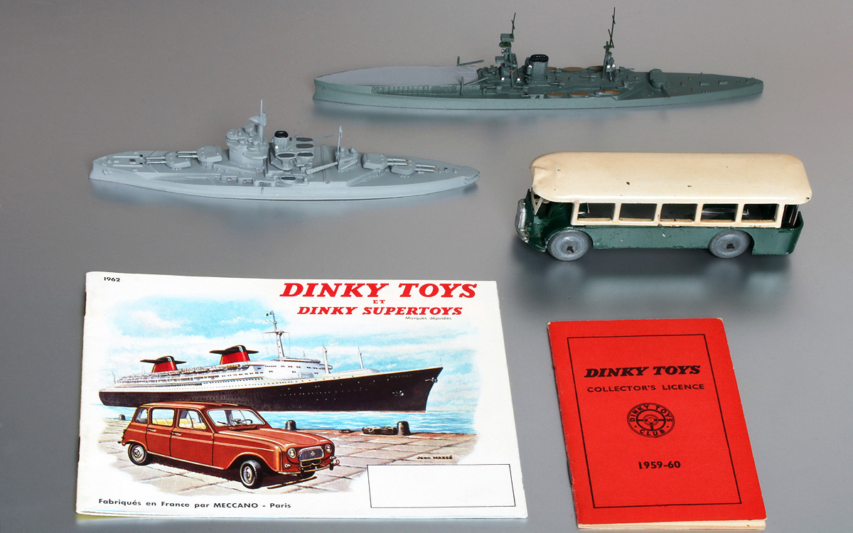 The Civilian Jeep and the Grue Salev are favourites if mine too. I'm still looking for the pale green Jeep. Nice models, Jonathan! I took pictures today of some recent arrivals. The French Renault Autobus parisien is the jewel amidst some more modest items. Though a little bit chipped it has no damage to the vulnerable tinplate roof, like rust, dents or any other deformations. Some paper documents too: the French 1962 Dinky Toys catalogue and the red 1959-60 Dinky Toys Collector's license. I wasn't aware that it is so small, 10.2 x 6.7 cm only! Two ship models slipped in between the Dinky stuff: a Queen Elizabeth class 'super Dreadnought' battleship and H.M.S. Furious, a very early British aircraft carrier, both made by Wiking on the 1/1250 scale.