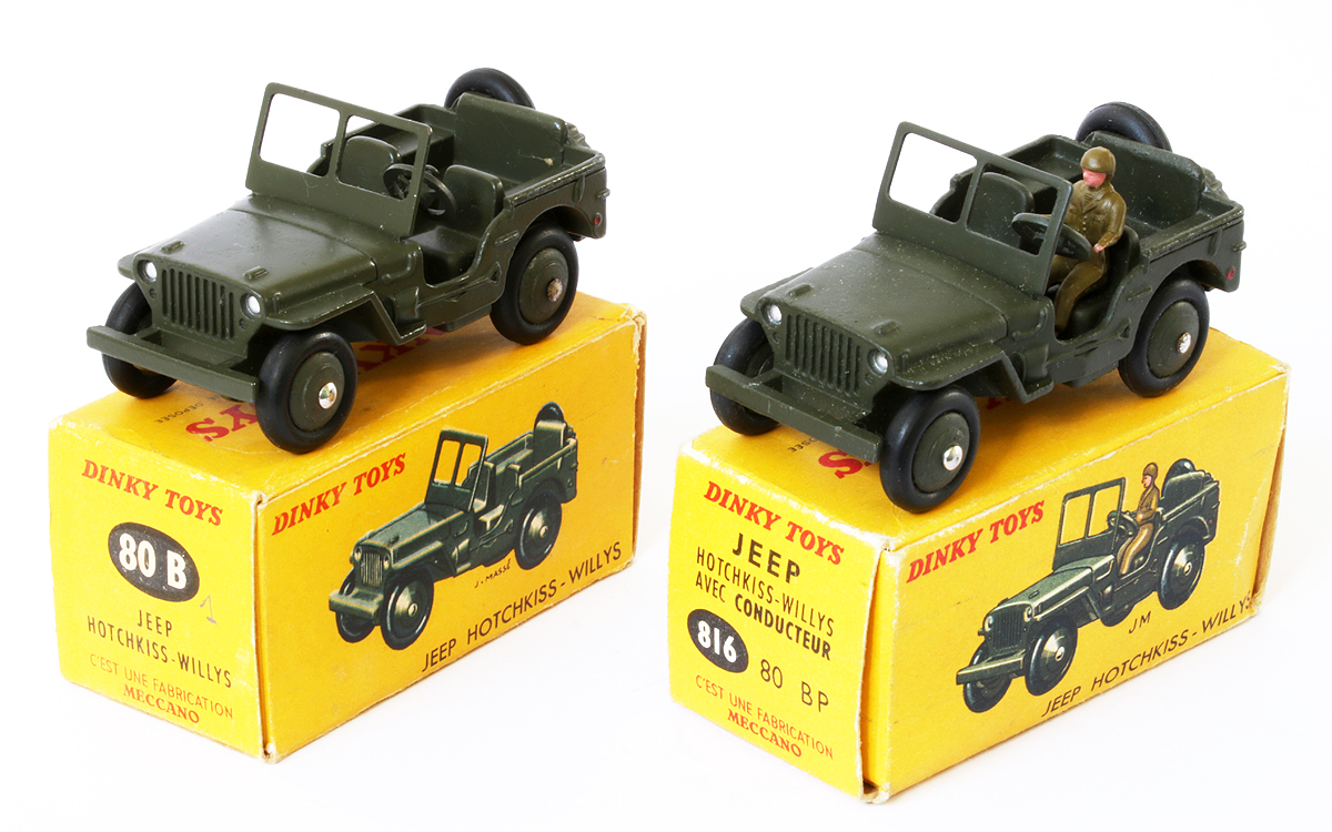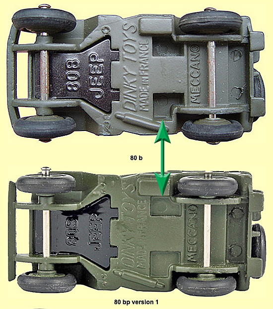 There are three versions for the Jeep with driver : 1) ridged hubs, smooth 15mm. tyres, no tow hook, reference 80 bp then 816 from 1959 2) ridged hubs, smooth 15mm. tyres, without, later with tin plate tow hook, reference 816 3) concave hubs, treaded 15mm. tyres, with tow hookand four different boxes : 1) remaining 80B boxes with additionnal 80 BP stickers en each end 2) 80 BP box 3) dual numbering box 4) 816 box