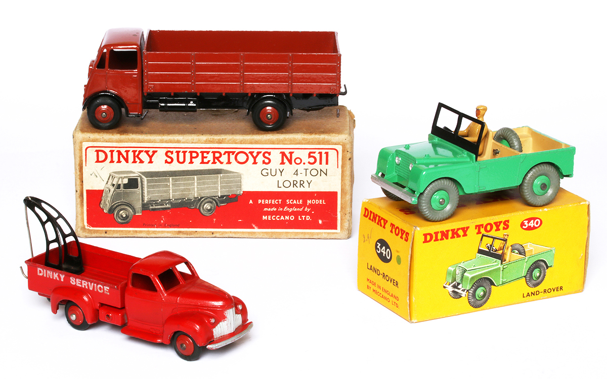 Very special and rare items indeed, Chris! Looking at the (apparent) axle widths they all, but the darker green Crane Truck, seem to be pre-war. The darker green example, with the fine treaded tyres, ridged hubs, thicker axles and the closed rear window must date from 1947 in my opinion. In the mean time I found a box for my unboxed green no. 340 Land Rover and a French no. 25r Camionnette de dpannage avec grue (1949-1954), the later issue with 'Dinky Service' in tampo print on the sides. It looks better than it actually is. There are a few nasty touch-ups, which I hate, but it was not too expensive and it's a great model after all. The previously shown brick red Guy 4-ton Lorry in the background. Kind regards, Jan