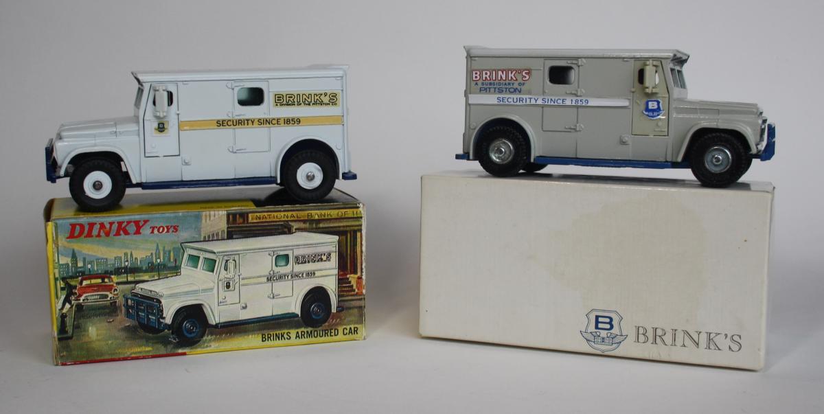 My recent new arrivals. I have wanted but avoided purchasing a regular issue Brinks truck for years due to the often chipped and very poor condition of the water slide decals and, melted wheels if you find a blue wheel version.. This example was on ebay and its decals are near perfect. The more common grey wheels were also on the real trucks whereas the blue ones were not. The Brinks company USA promotional was a welcome find as well and I have avoided purchasing one due to the often high price but this one didnt go that high. The big Foden dump truck with white hubs is a scarce late run version and it came from Germany. Its pictured with the usual yellow wheel version that was purchased for me by my mom in 1978 through the mail order section of the AVA run USA Dinky Toys collectors club newsletter. I was a member of the club as a child until it folded around 1981ish. It was fun to send away for models through the club and anxiously await the day the UPS or mail truck pulled up to drop them off. I found an original box which is pictured behind. The truck survived my childhood remarkbly well and it hasnt had a box in 45 years. Both trucks look real nice together and I need to dig out by Atlas excavator to pose with them. As a child in the 1970's the big size/scale of Dinky toys was the only size I knew and I lioved it. They were big, well made and heavy just like a diecast toy should be! Though I will admit thier size and heft does lead to display issues in my limited space. No wonder why Dinky/AVA redesigned the retailer display case in 1974 to be so big and heavy as it had to accomodate these large models. Ask Jon he will tell you how massive those cases are.