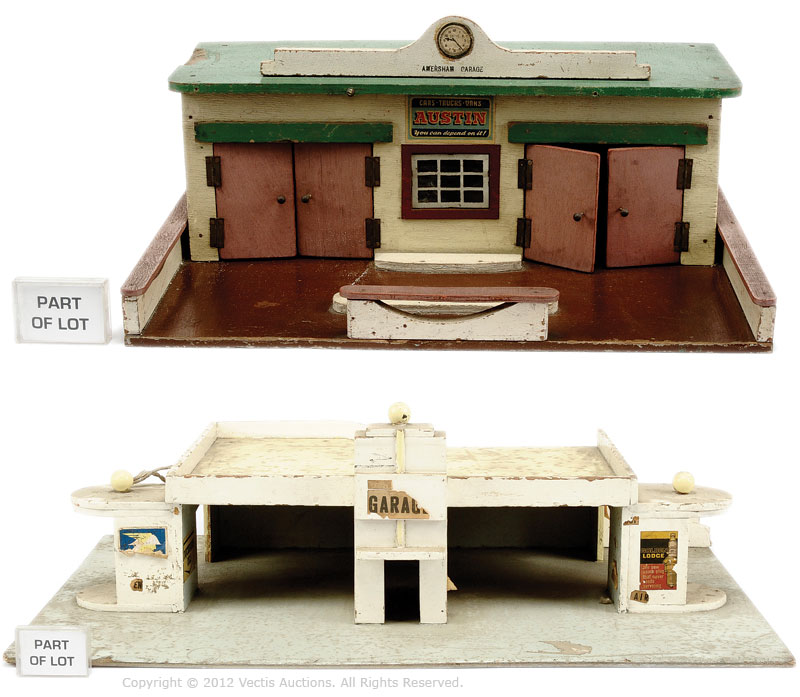 I had once a much admired O scale Modernist style white garage circa 1960 with rooftop parking and rear ramp, a central office tower with accesses either side and engraved sign and golden ball top, a clock tower with flagpole, side entrances and semi circular side pods topped with gold balls too. It came from my uncle who worked in Libertys so presumed purchased at nearby Hamleys - bespoke as my name was on the sign. I have only found similar once or twice on the web for sale and rather dilapidated. You may not have such in your book?