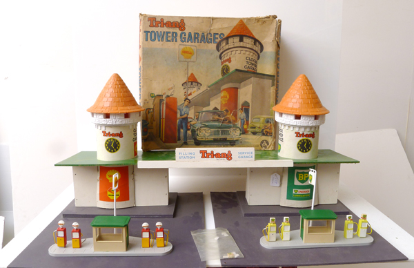Jan, Does your book cover the Triang Tower Garages set? I would love to own this amazing item, or at the very least get to see one in person some day. It is a unique Triang-Dinky crossover item and must date from shortly after Lines Brothers acquired Meccano Ltd. It was supplied with the Dinky Shell and BP pump sets in the box -- presumably unaltered from standard, and retaining their Dinky labels on the bases? Apart from the inclusion of the Dinky components, this garage is also of interest because the same conical orange roofs for the towers were employed on various castles that Triang produced. (I once owned one of the castles, so could not miss the resemblance.)