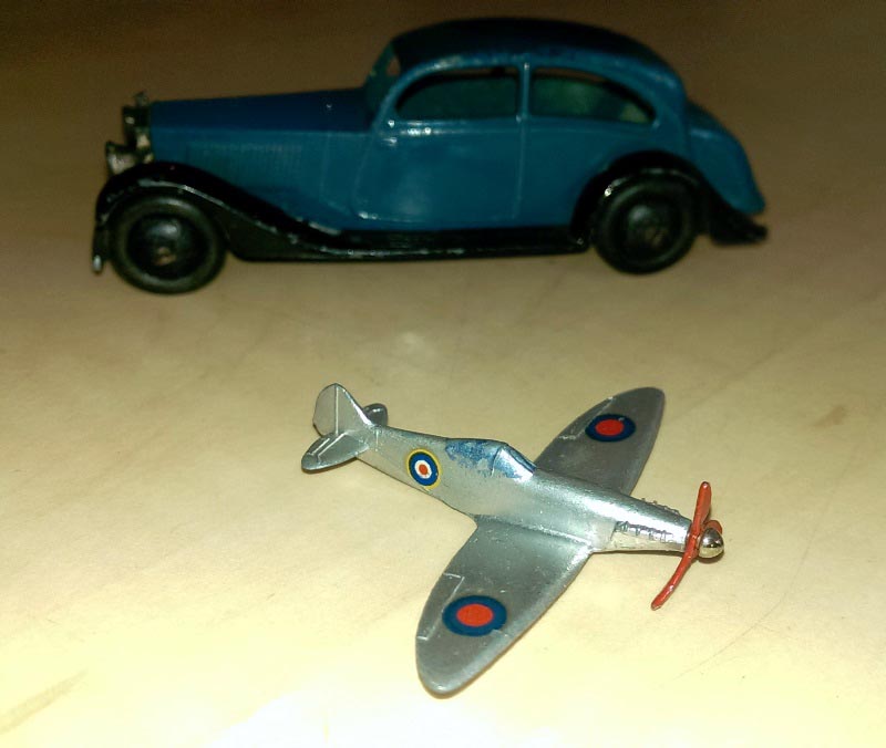 Hi all, Just unpacked the latest two arrivals. A Rolls Royce in teal blue with smooth hubs and an open chassis. A quite different color than the usual dark blue or saxe blue. The Rolls is accompanied by a post war Spitfire. I took me quite some time to find a decent one. Love the scale difference! Kind regards, Rob