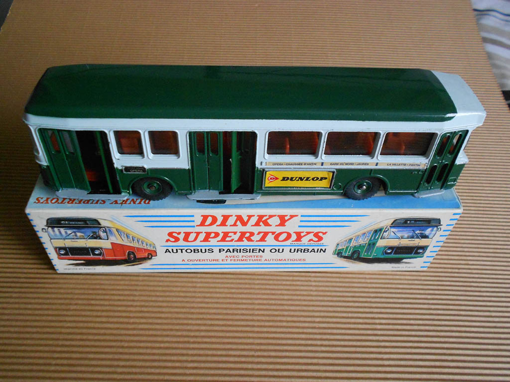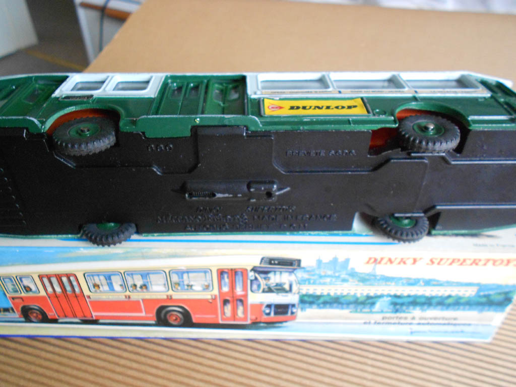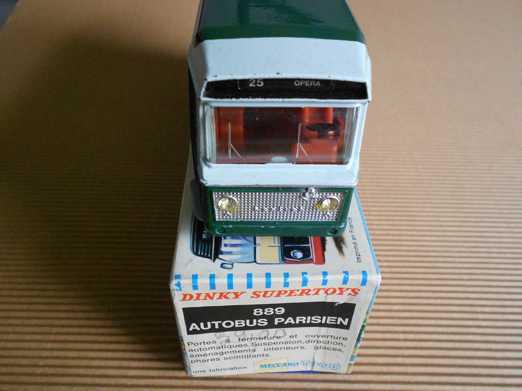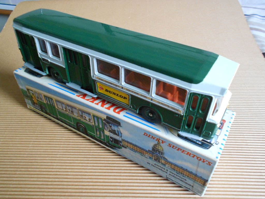 Trundling into the collection this week is a green 889 Autobus Parisien. There is a red version 889U Autobus Urbain, presumably suitable for towns other than Paris and supplied in the same dual purpose lidded picture box (the box end blurb may be different). Pulling back the front wheels closes the plastic doors and pressing down the back wheels opens them. Sort of. The door hinges are ultra fragile and the doors on this example are somewhat perished. Originally there was a sticker sheet of advertising panels which a previous owner has applied.