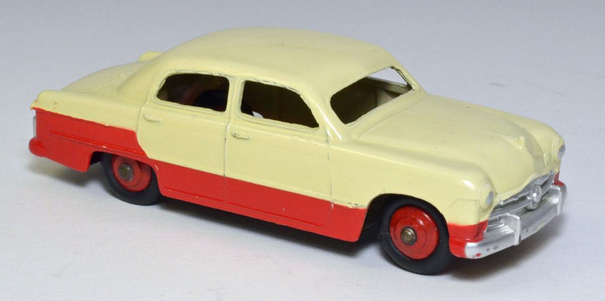 You will notice with the above, the line before the front wheel arch is not straight due to the lack of some form of guide on the casting. Other models were also treated similarly with 'Highline' and 'Lowline' painting, such as the 172 Studebaker Land Cruiser. and the 171 Hudson Commodore. (You will also notice that the base colour pink is more of a fawn colour, which is unusual. When this model went into the paint shop, the system had most likely not been thoroughly flushed, the result being a slightly different shade than normal due to an accidental mixing of the true pink with some other lighter colour paint. Being a toy, this did not matter as after a few models had been sprayed, the actual pink started showing. The paint underneath and inside the body is exactly the same as on top, so there has not been any fading.) The 'Lowline' was introduced at least by July1957, the date when the 1957 catalogue was printed, although the design of this would have taken several months prior to that. With the 'Highline' version only being issued for a little over 12 months, and the 'Lowline' from 1957 to when the model was deleted sometime after October 1959 it can be seen that the 'Highline'would have had far less manufactured which explains why this version is less common these days. (Some collectors consider that both versions are uncommon!) Mike and Sue Richardson's tome, 'The Great Book of Dinky Toys' is an excellent source of information should you wish to read more on the history and development of Dinky Toys. Unfortunately, it is long out of print although a copy may be found through