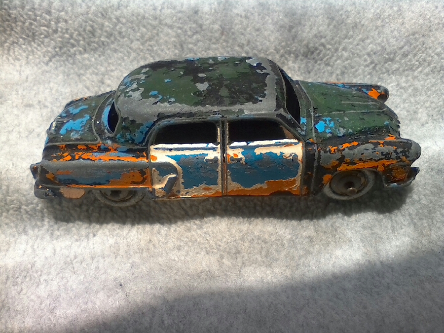 Thank you Bruce for a comprehensive answer to my query. it's obvious now that you've pointed it out but I somehow had it in mind that the difference was in the casting. Doh! I have an all tan example of the Ford and an all blue Studebaker but perhaps you'd like to see my multi-coloured Studebaker? It began life as an all blue example but, from the evidence that I uncovered while stripping it, it has obviously had a chequered career. I've tried to determine which colour came before the next but it's proved tricky. Suffice to say it has been Blue, Dark Green, Orange, White, Pink, and ultimately Matt Black. Discovering all these layers was a surprise and I made the decision not to proceed any further with restoring this rather battered example and to leave it as it is. it's history is there for all to see and, to be honest, it's grown on me. What do you think?
