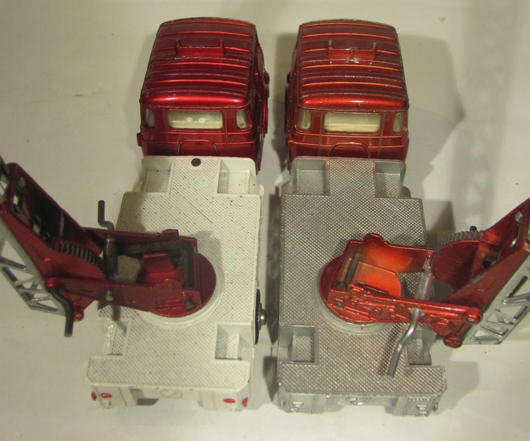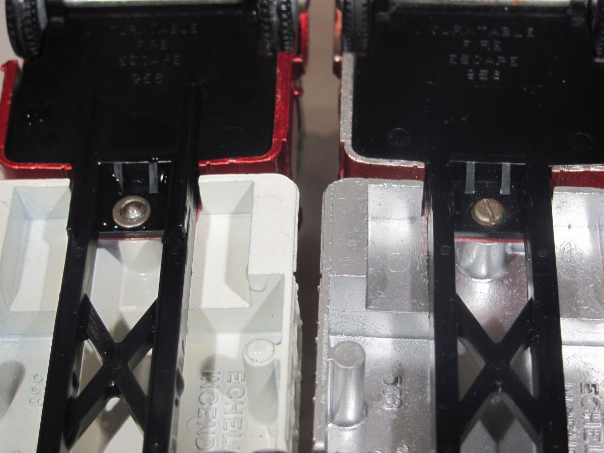 G'day all, I have just reeived another version of the Dinky 956/2 (Berliet) Turn-table Fire Escape. This came about when I noticed my existing verioin had a rivet behind the cab that went right through the chassis, replacing the screw of the original. So I did an impromptu survey on eBay 956/2s and found that half had the rivet and half didn't. So I managed to secure an unriveted one for a reasonable price and postage (some postage costs are above the original cost of the item!). It has now arrived and the reason for the rivet replacing the screw is obviously because if the screw is removed (by little hands?), the thin plastic chassis is likely to break at that point. The frame has also been reinforced at that point as well. Ron F