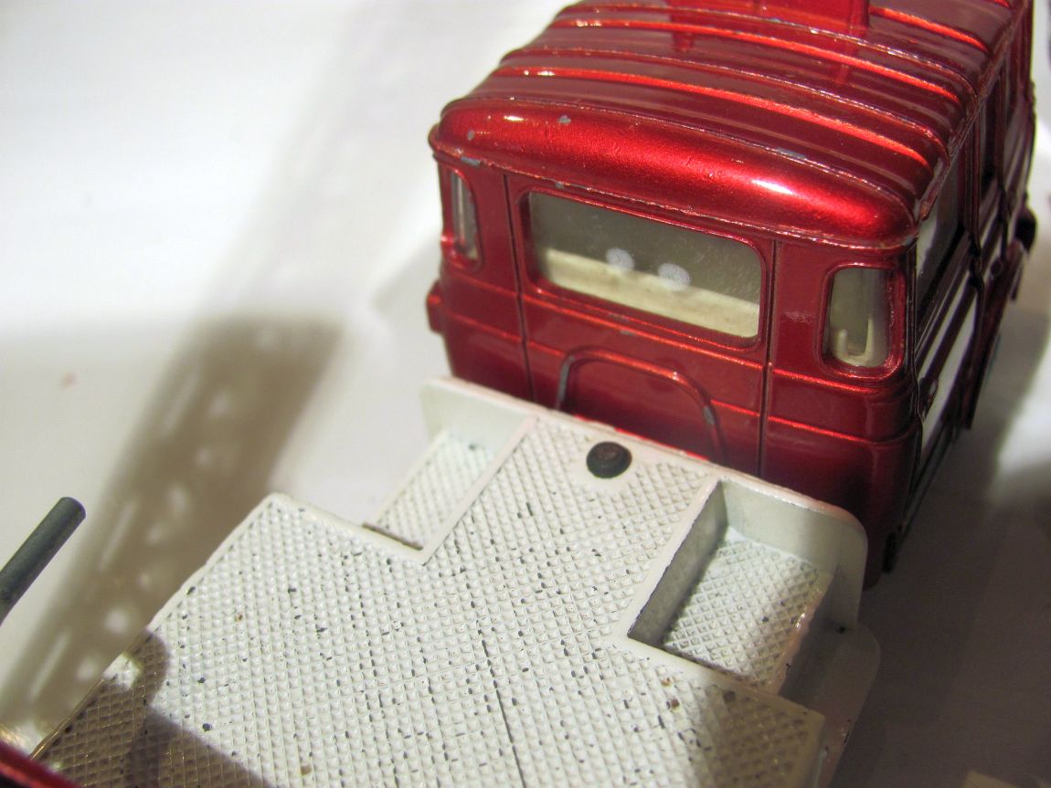 1200 836 Now this is a Dinky Toy that has received countless layers of house paint! It started life if I can recall, as a deep brown or maroon. During its service, the rear axle has been replaced by Dad with a 2' nail, skillfully soldered and the excess removed.