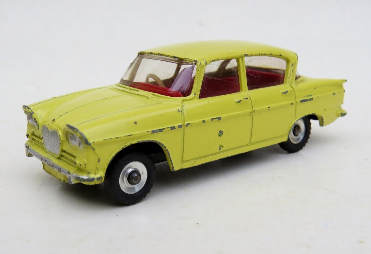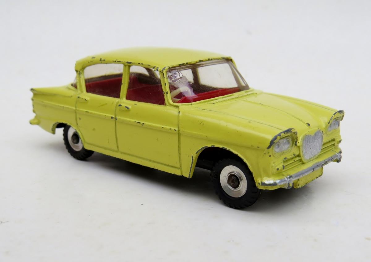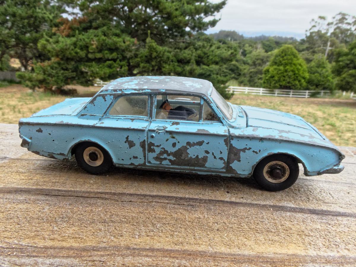 This Corsair arrived in the post today, and I must say it is the most chipped Dinky Toy I have ever purchased. The paint looked bad in the eBay photo, and then it was probably made even worse by the fact that the seller shipped it to me in a padded bag instead of a proper box. The reason why I am happy to have the model, at least as a placeholder, is not only that the light blue colour on this car is harder to find, but also that this is the version -- with the driver figure -- that came in the elusive Fun Ahoy gift set. I purchased a sample of the relevant Healey Sports Boat, with its added figures, several years ago. Unfortunately whether because of the poor packing or a previous rough life, the figure is adrift inside the car. Thanks to the Corsair's opening windows, there is some hope of grabbing it and forcing it down onto the hole in the driving seat, but even if I can find the right tool, that is a test of dexterity I may never pass!!