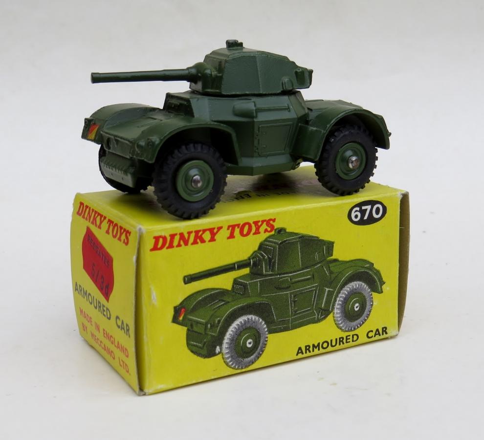 I was quite eager to unpack this equally uncommon 582/982 Pullmore Car Transporter in all mid-blue, as the photographs did not really match its description, but needless to say, I am delighted with its condition. Next to come hopefully, is a correct box![/b] The next to be unwrapped was this late issue 670 Armoured Car with its plastic hubs and light yellow end-flap box, which judging on the flaps the model has hardly seen the light of day since it was made in 1969. Does anyone know of a toy shop named REDGATES?