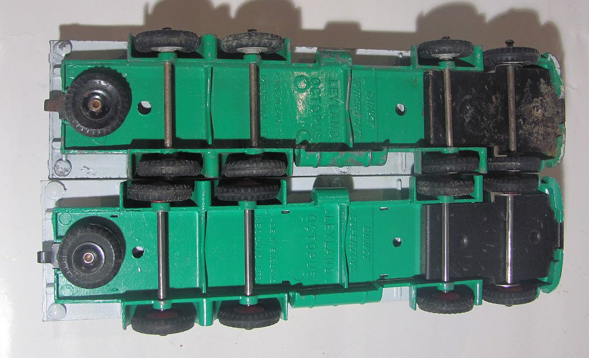 Hi all, One of my favourite Dinky Toys in the Leyland Octopus. I could not resist a 935 Leyland flat truck with chains fitted with grey wheel hubs, although it was play worn. I have a mint boxed red wheel one and it was interesting to compare them. The later grey wheeled one does not have the tin-plate tank slots and the screw holes for the plastic tank are larger. The green paint is slightly darker and the ejector pins are more prominent - probably 'wound back' since the removal of the tank slots. Ron F