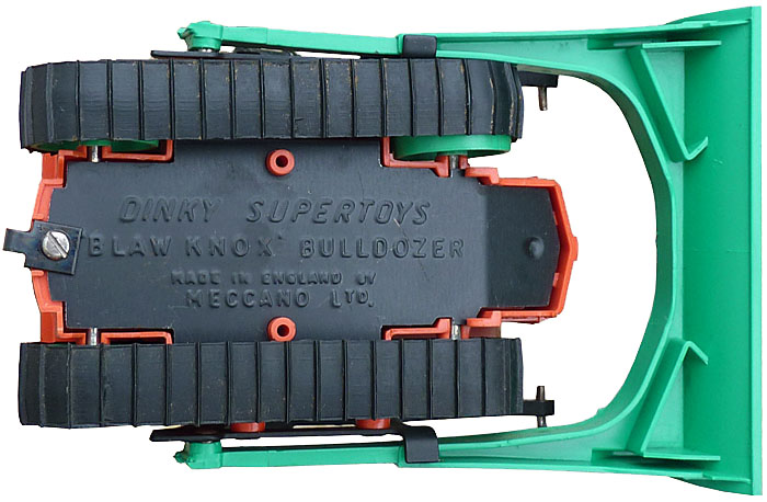 700 458 The base plate has been modified for the plastic dozer on which the plate is attached by only one screw when the on the zamac model it is attached by three rivets.There is no evidence that the die has been modified but it is very likely that the mould for the plastic model is entirely new as three out of five of it's parts had to be made new. I have not seen the British Standard for toys but it may contain a weight / size ratio limit. This limit may be one of the reasons for turning the bull dozer to plastic and to make some large Dinky out of aluminium.