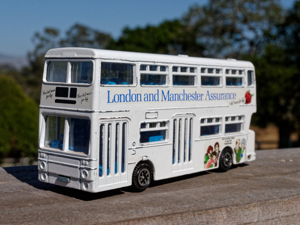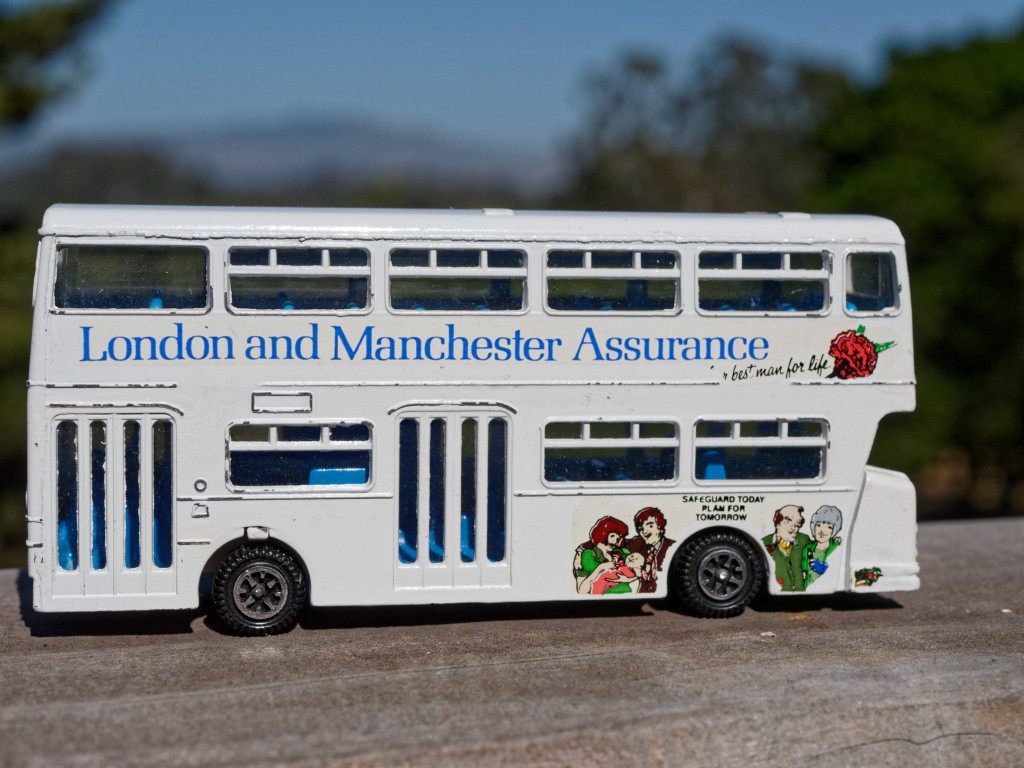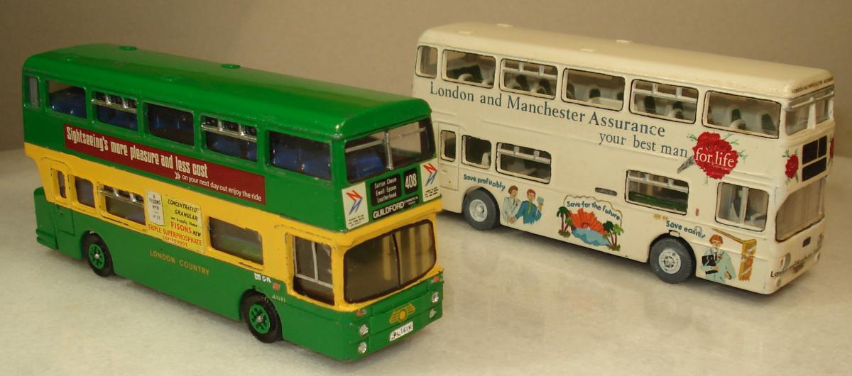The London & Manchester Assurance bus is a very nice addition to your collection. I doubt I'll ever manage to get one of these, but I do have a nice Code 3 version which was made by someone (not me) to represent a real bus which carried this advert on the 1970s. The most impressive feature is the way they have moved the staircase to match this particular bus - check the window layout on the lower deck. The green and yellow bus has also had a similar operation carried out (also not by me - I don't have the skill or patience for this!).