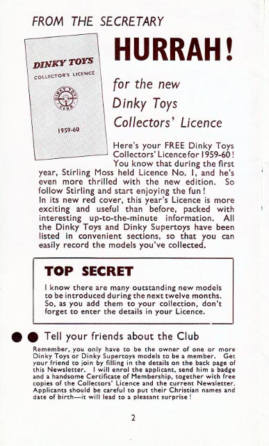 Greetings All How many Newsletters were issued for the 1959-1960s membership of the Dinky Toys Club by Meccano? I have three in booklet format and three in tabloid format. Someone wrote or told me that there were more than three issued in tabloid size before the club wound up due to it being too successful and a drain on Meccano's resources. The Great Book of Dinky Toys only wrote about the club, badge, the special badge for the visits to the factory (anyone seen or have one of these?) and licences but makes no mention of these newsletters, unless I have missed it. If it was missed, how many other Dinky-related subjects were also left out? By the way, The Great Book mentions a blue licence that was issued to club members. What year was this one, as I thought the yellow licence for 1961-62 was the last one issued. Kind regards Bruce (150) #523