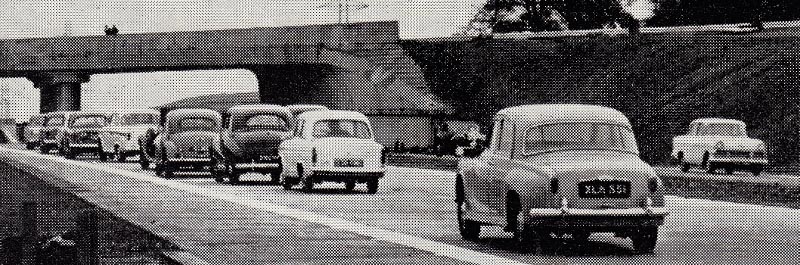 Yes - Britain's secret invention - a driverless motorcar! Unless my eyes are deceiving me, but I do not think the Rover has a driver, nor do I think the Austin and Morris which leads me to suspect that the photograph has been staged for the benefit of the opening of the new M1 Motorway! Not to mention all the other cars are 'driving' too close to each other!And to think all these years I thought it was a photograph of high-speed traffic on the M1. Yes, I also realize I am being too finicky! ;)Kind regardsBruce (150) #504