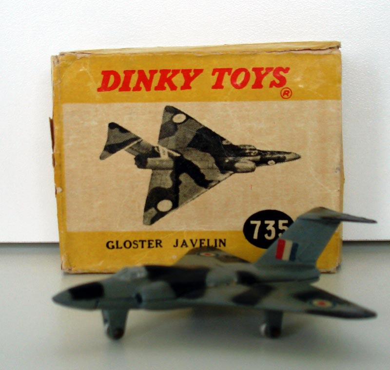 Hi all, Luck has been on my side in finding another Indian made Dinky Toys on eBay, from an Indian seller. It is the the 735 Gloster Javelin with its very flimsy but still complete Dinky Toys box. The model is marked Dinky Toys and painted in grey and very dark grey, almost black camouflage. The English made Gloster Javelin is in grey and green camouflage. Kind regards, Rob