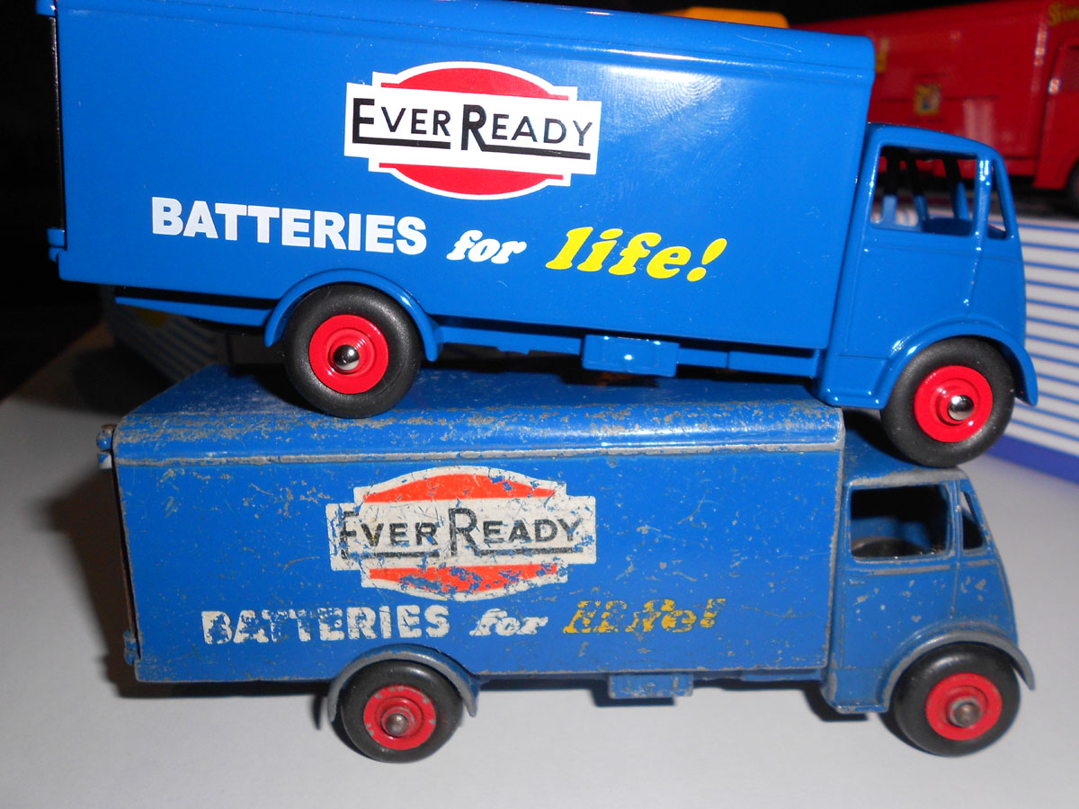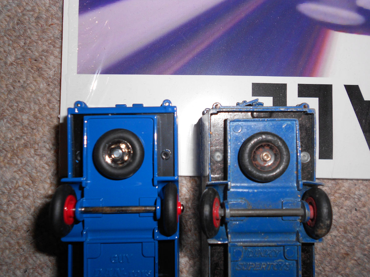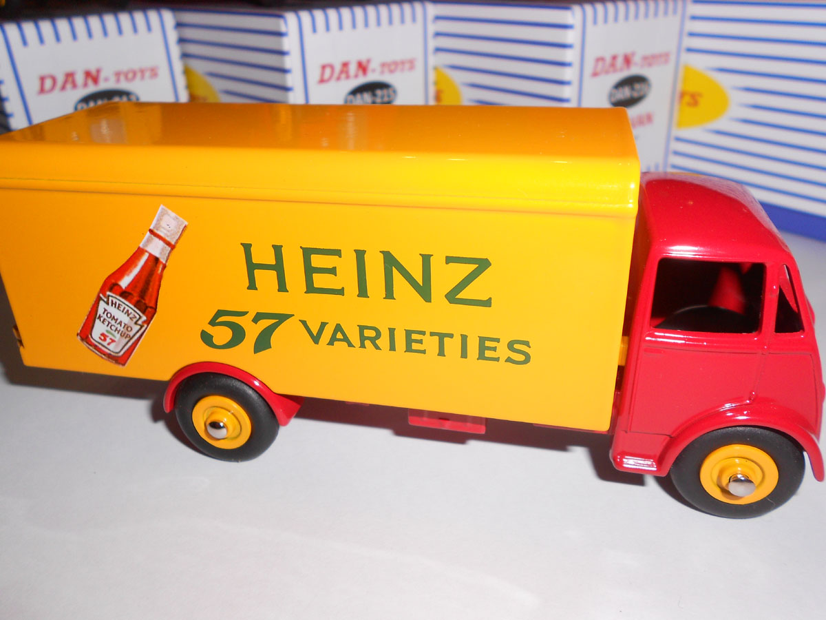 As mentioned by Mike Forbes in the October #59 issue of the DTCA Journal, Dan-Toys have a new range Dinky Guy van reproduction models. I bought mine direct from the dan website for a discount and free postage deal, which works out at just under 24 for each van. The six original dinky paint schemes are available with a seventh innovative Heinz Ketchup version. All the castings take after the type-2 guy chassis with the reinforced bumper, and there is also some minor strategic reinforcement of the door sills and hinge brackets. Like other chinese copies, the paintwork is immaculate. The transfers are perfect and, for the most part, faithful recreations. Perhaps the Ever Ready badge looks somewhat altered, but it is still quite plausible since the makers have opted to imitate original fonts rather than substitute similar modern alternatives (looking at you, Atlas).