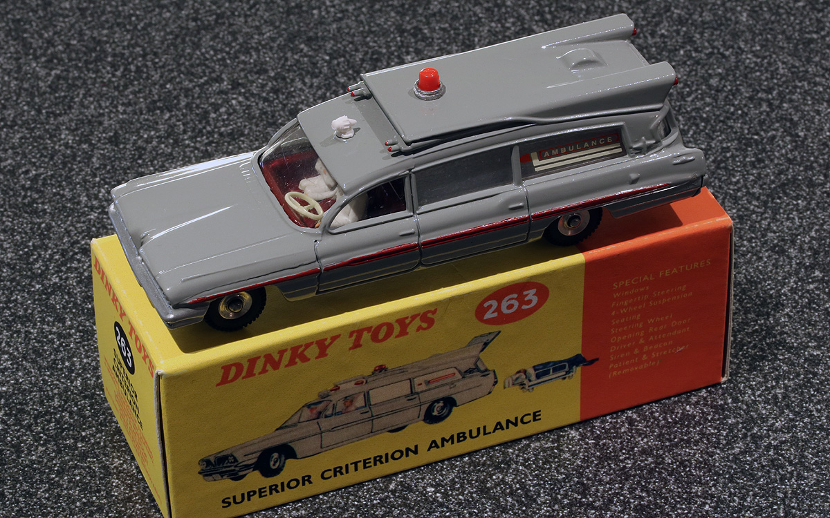 This restoration was dealt with last January already in the British Emergency > -263 Superior Criterion Ambulance (1962-68) topic. A little bit revised I thought it might be a nice new contribution to this Restorations, Conversions, Code 3 folder too. I was given quite a number of play-worn Dinky Toys by a former colleague of mine several years ago already, a pitiful Superior Criterion Ambulance included. Last year I had the idea of having it restored and giving it a grey finish, similar to the finish of the post-war examples of the 30f Ambulance, and as an experimental addition to the existing colour schemes of the ambulances of the 1940s-1960s. Not a very complicated conversion, but the result is surprising in my opinion. I thought the turquoise interior should be given the same red as the strips on the sides, in order not to look too pale and dull together with the all-grey body. Perhaps the red strip is not as straight as I would have meant it to be, but, nevertheless, the overall result is satisfactory in my opinion. A replica box makes the whole complete. Now I have a cream and a grey Superior Criterion, inspired by, parallel to the cream and grey early 30f Ambulances. And now, together with the original no. 263 and the turquoise metallic no. 277, the one with flashing light, a new inconventional trio of Superior Criterions makes part of the collection! Kind regards, Jan